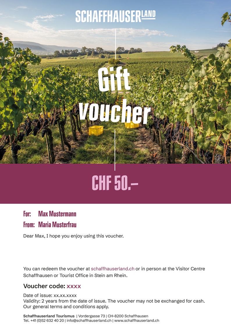 Whether it's a private group tour, a relaxing cruise on the wine boat, an enjoyable culinary tour through Schaffhausen and Stein am Rhein or regional souvenirs and fine wines from the Blauburgunderland - our voucher offers the right experience for every taste.