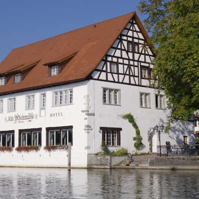 A few kilometers from Schaffhausen, the young Rhine flows right past the windows of the Alte Rheinmühle restaurant and hotel.