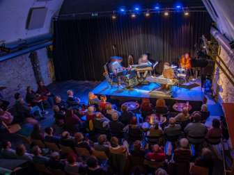 The pub becomes a club for the Fassjazz concert series, its walls a barrel gallery, and the small basement room a stage for cabaret, youth theater, readings from the Schaffhausen Book Week, lectures, and concerts.