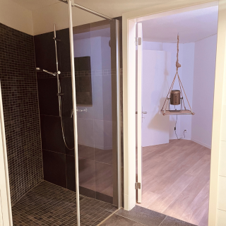 Das AirBnBar bietet zudem eine voll ausgestattete Küche, einen Essbereich sowie ein Badezimmer mit Toilette, grosszügiger Dusche sowie Waschmaschine & Tumbler.