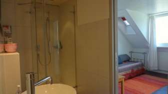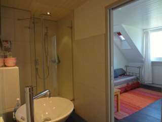 On the upper floor of the house there are 3 rooms with en-suite shower/WC for guests: A studio with 2 to 4 beds, a room with 2 single beds and a room with 1 double bed. TV and internet are available in all rooms.