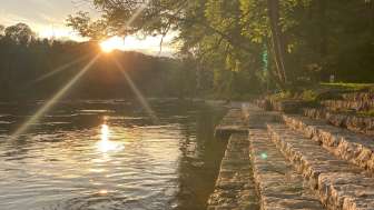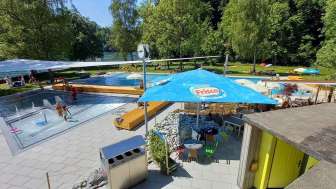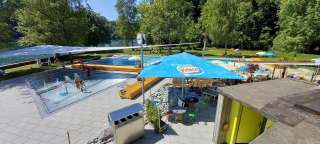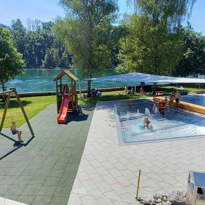 A riverside swimming pool on the Rhine, peacefully located in the forest, featuring additional swimming and paddling pools. It includes a 16-meter swimming pool with 4 lanes, a small non-swimmer pool, a separate paddling pool with a small splash area, a children's slide, a 2-meter diving platform into the Rhine, a playground with equipment, and a barbecue area. Please note that this is a bathing area in open, flowing water, and swimming in the Rhine without experience should not be underestimated.