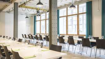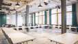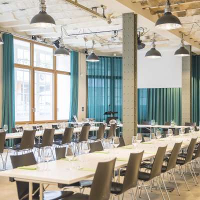 The event location on the SIG site at the Rhine Falls is available for versatile use. Whether for a workshop, general meeting, seminar, or private celebration – the unique ambiance of the room with its industrial flair and modern equipment will inspire you. Two projector systems, a speaker's desk with microphone, flipchart, whiteboard, and Wi-Fi are available. The seating arrangement of the hall will be set up according to your wishes. For catering during your event, the adjacent Restaurant Grünerbaum offers a diverse menu and is happy to accommodate your individual requests. The SIG site at the Rhine Falls is easily accessible by public transport. Visitor parking spaces are also located in the immediate vicinity of the event location. The SIG site at the Rhine Falls offers a unique meeting place with an exceptional location directly above the Rhine Falls. You are welcome to arrange a non-binding viewing appointment with us. We look forward to hearing from you.