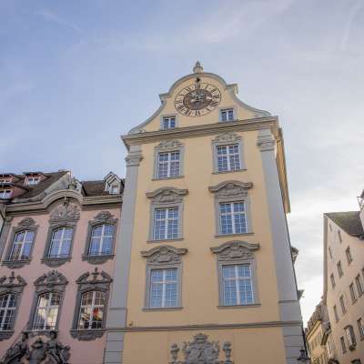 In the gable field of the tower you can see the astronomical clock by Joachim Habrecht, which shows ten different possibilities: