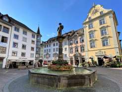 The large market scales used to hang in the Fronwagturm, which were used to weigh the goods that were unloaded from the ship in Schaffhausen and loaded back onto the ships below the Rhine Falls. The scales are now in the Museum zu Allerheiligen.