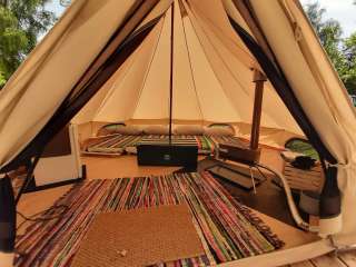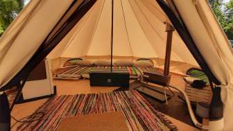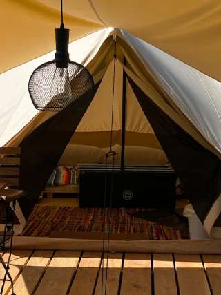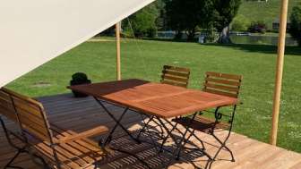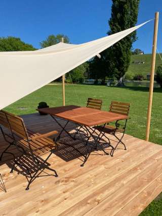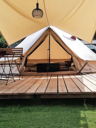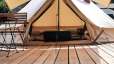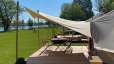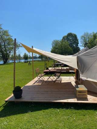 For a great glamping adventure, there are three new Walden rental tents right next to the banks of the Rhine. From the cozy wooden terrace you have a wonderful view of the Rhine and nature, which can be enjoyed with dinner and a glass of wine. The awning in front of the tent provides shade or protection in the rain. The tents are located near the barbecue area, where wood is available for a barbecue or a nice campfire.
