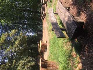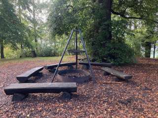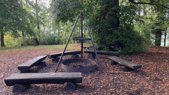 Cozy fire pit in the forest with benches and grill rack. There is a playground next to it.