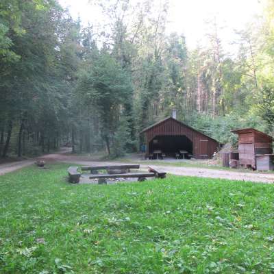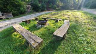 A spacious barbecue area with plenty of seating. Some seats are located in a small, open hut and offer shelter in bad weather.