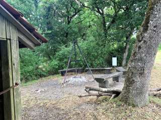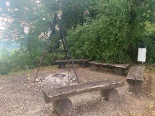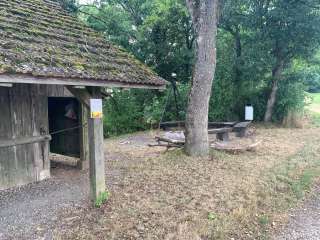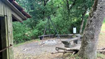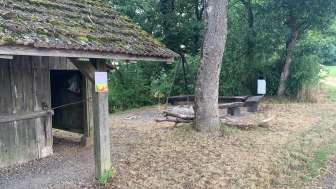 The Rummele barbecue area in Oberhallau has an open fire pit with five wooden benches around it. Next to it is a small wooden hut with a shelter.