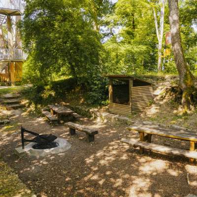 Feuerstelle mit Holz, Tische und Bänke, Spielplatz direkt beim Siblinger Randenturm.
