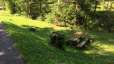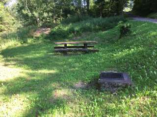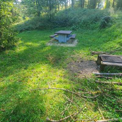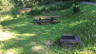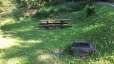 The Spitzwiesenweiher barbecue area has a small fire pit and a table with benches.