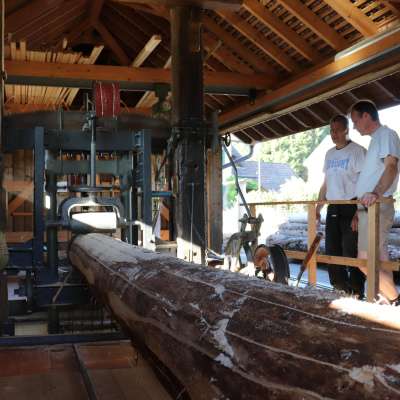 Efficient sawing of logs was only made possible thanks to electricity. The saw was and is powered by a powerful 18 hp electric motor. The drive, the large transmission, the full frame saw, and the ingenious feed mechanism make the saw so special—it is a link between the single frame saws that were powered by water and modern sawmills. A craft exhibition offers you further insights into old professions. Experience a sawing demonstration in the Gattersagi! Until April 30, 2021, Buchberg : "Säger" (Sawyer) at the "Handwerksmuseum Gattersagi Buchberg(Buchberg Sawmill Craft Museum) Guided tours of the new "Säger" exhibition with a short film about the profession. Visitors will learn a lot about buying wood and sawing beams, boards, and slats. Newly installed transmission. Sawing operation with the 90-year-old Gattersagi: Duration: 1 ½ hours. Or simply a guided tour without sawing: Duration: 1 hour. Guided tours on request info@gattersagi.ch from Robert Kern, Murkatstr. 22, 8454 Buchberg, telephone 044 867 30 21 or Otto Weilenmann, telephone 044 867 36 43.