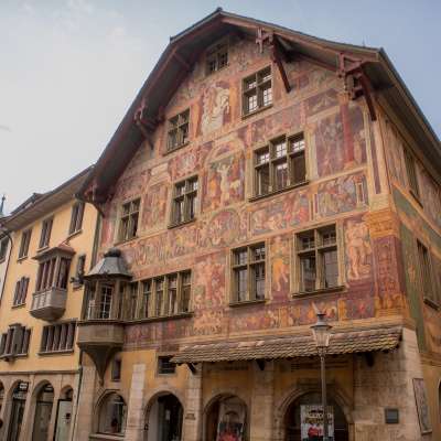 Rebuilt in 1566 by Knight Hans von Waldkirch, who had the façade painted by the famous Schaffhausen painter Tobias Stimmer in 1568/70. Original frescoes masterfully recreated in 1938/39 and 1943 by Carl Roesch, Diessenhofen, in the spirit of Tobias Stimmer.