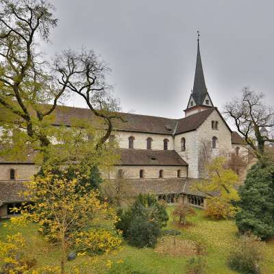 The largest cloister in Switzerland. Partly Romanesque 12th century, partly Gothic 13th century, it encloses the romantic, enchanting cloister garden, the so-called "Junkerfriedhof", where high Schaffhausen magistrates such as mayors, councillors, priests and other deserving citizens were buried from 1582 to 1874.