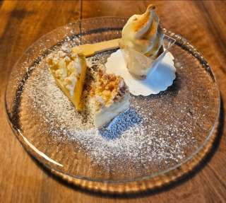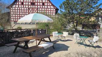 Admire the renovated Kalberer stable and the impressive 18-meter high gable of the barn, accompanied by exquisite cake and an excellent selection of desserts. Alternatively, enjoy a delicious soft-serve ice cream or a delightful aperitif by the stream.