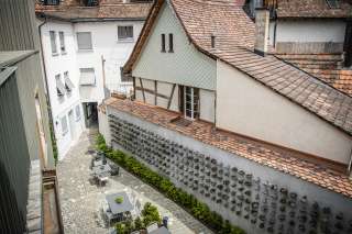 Der Innenhof überrascht: Hier hat der australische Künstler Jamie North eine markante Skulpturenlandschaft kreiert. Eine Wand voller schwebender Steine verleiht dem Innenhof Struktur und Charakter. Kunst und Natur verbinden sich auf einzigartige Weise miteinander. Wer dem geschäftigen Treiben der Altstadt für eine Weile entfliehen möchte, findet hier ein ruhiges Plätzchen.