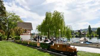 Treat yourself to a ride lasting just under 10 minutes and enjoy the experience of being pulled along the beautiful Rhine by a model electric locomotive from times gone by or by a large model steam locomotive, huffing and puffing.