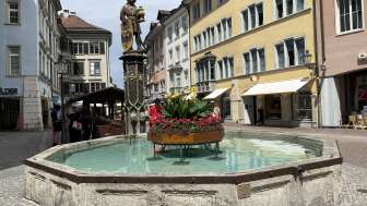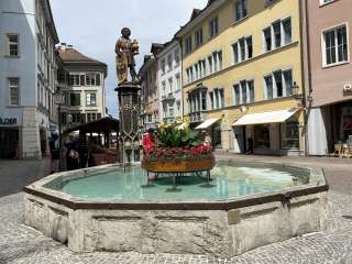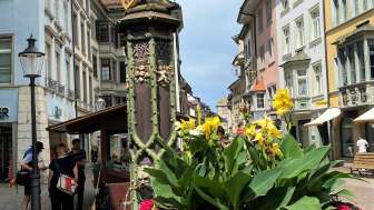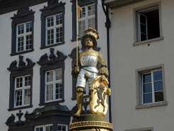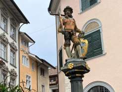 The Mohrenbrunnen was formerly known as the Schwertbrunnen. In 1535, the original wooden fountain was replaced by a stone one. The column dates back to 1520. The Mohrenbrunnen was named after Caspar, depicted as a Moor, the youngest of the Three Wise Men, holding a scimitar, a golden chalice, and a coat of arms. It is affectionately known as 'de Mohrejoggeli' by the locals. This unique fountain figure symbolizes the prosperous city dweller.
