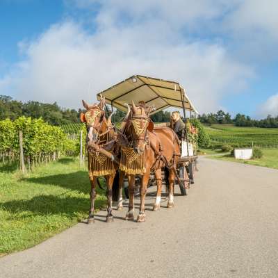 Far away from the hustle and bustle, enjoy a leisurely horse-drawn carriage ride through the vineyards. Let yourself be driven around the region and choose the point of arrival and departure according to your wishes. On request, the coachmen can offer wine and mineral water in the carriage.