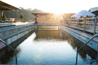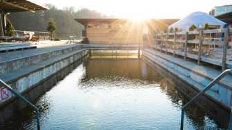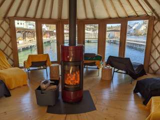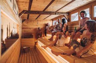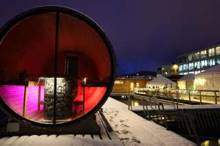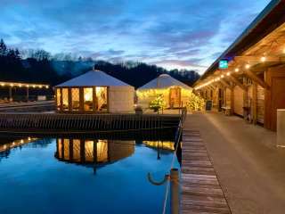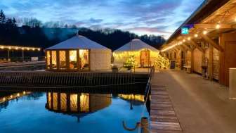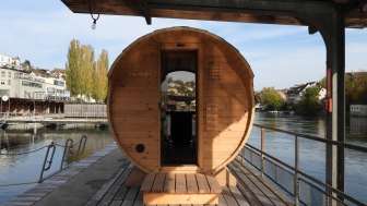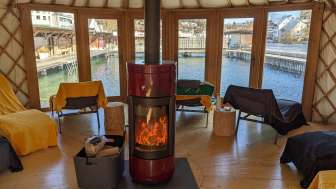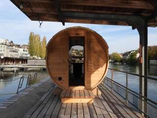 During the cold winter months, the Sauna Yurt Village is the perfect place to relax and warm up. Located in Switzerland's largest preserved box bath, you can choose between a barrel sauna offering beautiful views of the Rhine and Schaffhausen, a Swiss stone pine sauna with a soothing aroma, and a yurt sauna featuring hot infusions. After your sauna session, the Rhine provides a refreshing cool-down, and in the relaxation yurt with its large window front, you can quickly forget the stresses of everyday life. Our bistro yurt offers refreshing drinks and delicious food. The Yurt Village can also be rented exclusively.