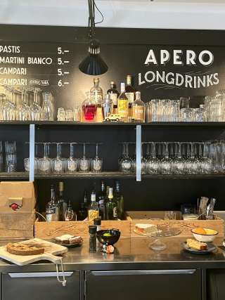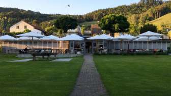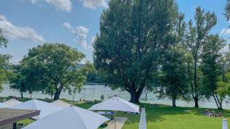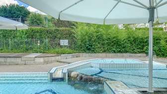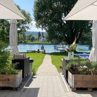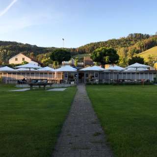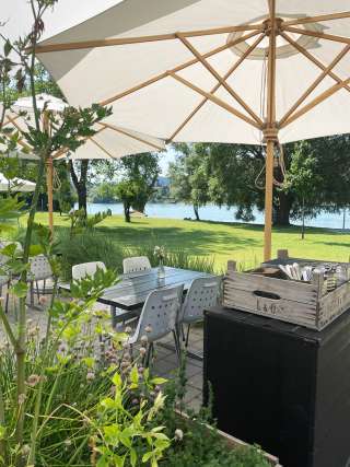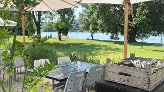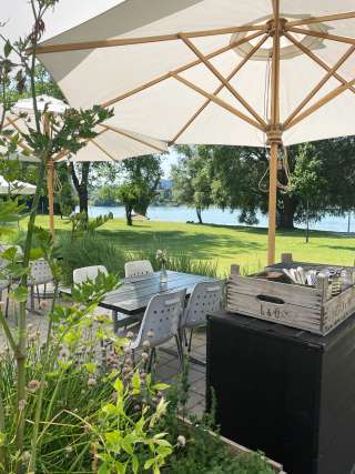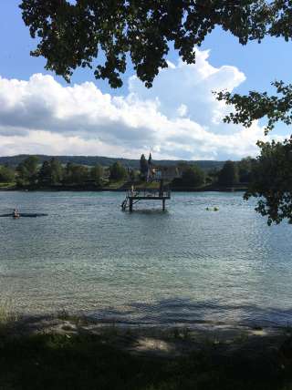 A lido with a large sunbathing lawn directly on the Rhine, featuring old trees, a children's playground, a children's paddling pool with a sun canopy, a diving tower (accessible only with lifeguard supervision on weekends and during summer holidays), a volleyball court, and the "Uferlos" café offering many delicacies and a special atmosphere.