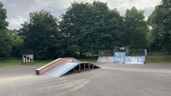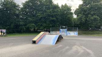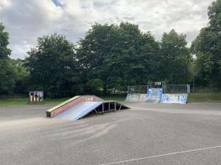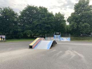 The small Bühl skatepark features a ramp and various obstacles for learning new tricks and for skateboarding, scootering, or BMX riding.