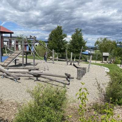 Playground with lots of exciting play elements for all ages: slide, sand area, climbing tower, see-saw and blancier area.