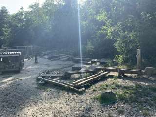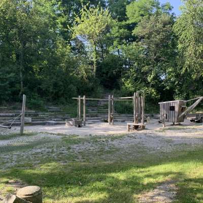 At the Dreispitz playground, children of all ages can truly let loose. This spacious facility is surrounded by lush greenery. The playground features a zip line, a slide, a pond, a fountain with a water feature, and a large sand play area. Additionally, there's a picnic spot with seating and a fire pit right next to the playground.