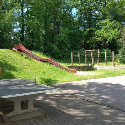 Playground with many exciting play elements for all ages: swings, slide, sand area, horizontal bars, balancing area, climbing net, and much more.