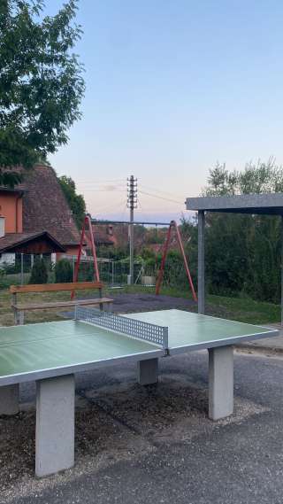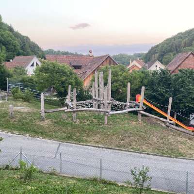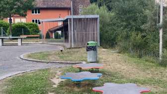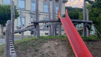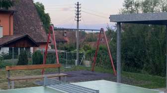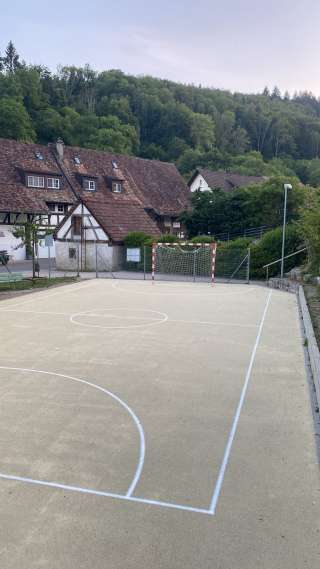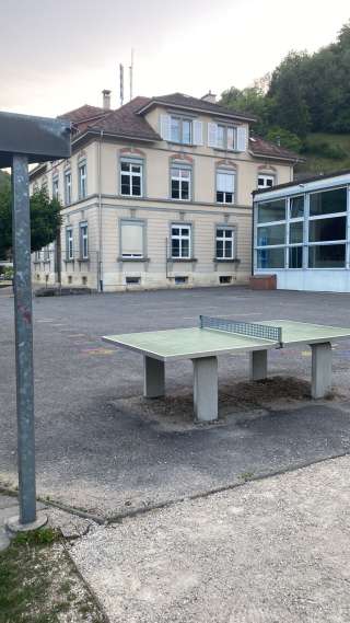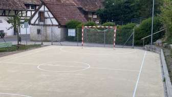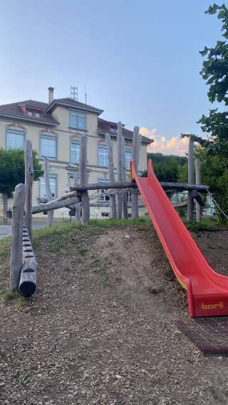 The playground in the village center of Hemmental is located right next to the school building. In addition to a climbing frame, a swing, a seesaw and a ping pong table, it also has a hard court with a basketball hoop and a football pitch.