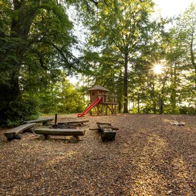 The playground is equipped with a wooden climbing tower with a slide and a swing. There is a barbecue area right next to it.
