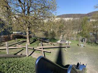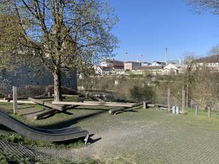 Ein kleiner Spielplatz mit Rutschbahn, Kletterseilen und Balancierbalken beim Schloss Laufen lädt zum Austoben ein.
