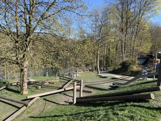 A small playground with a slide, climbing ropes, and balance beams at Schloss Laufen children to let off steam.