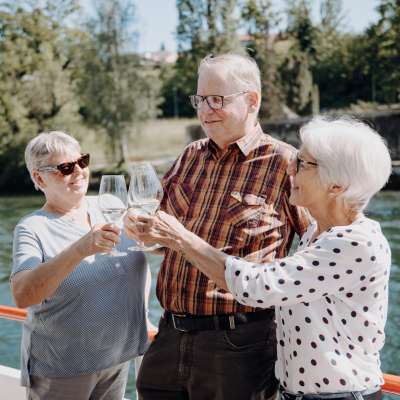 Degustiere auf der Fahrt von Schaffhausen nach Stein am Rhein die köstlichen Tropfen aus dem Schaffhauser Blauburgunderland an Bord der URh und geniesse dazu eine der schönsten Strom-Schifffahrten Europas.