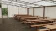 With barbecue area, WCs, hot water and kitchen. Space inside for 40 people, in summer with up to 60 covered seats outside. Parking available.